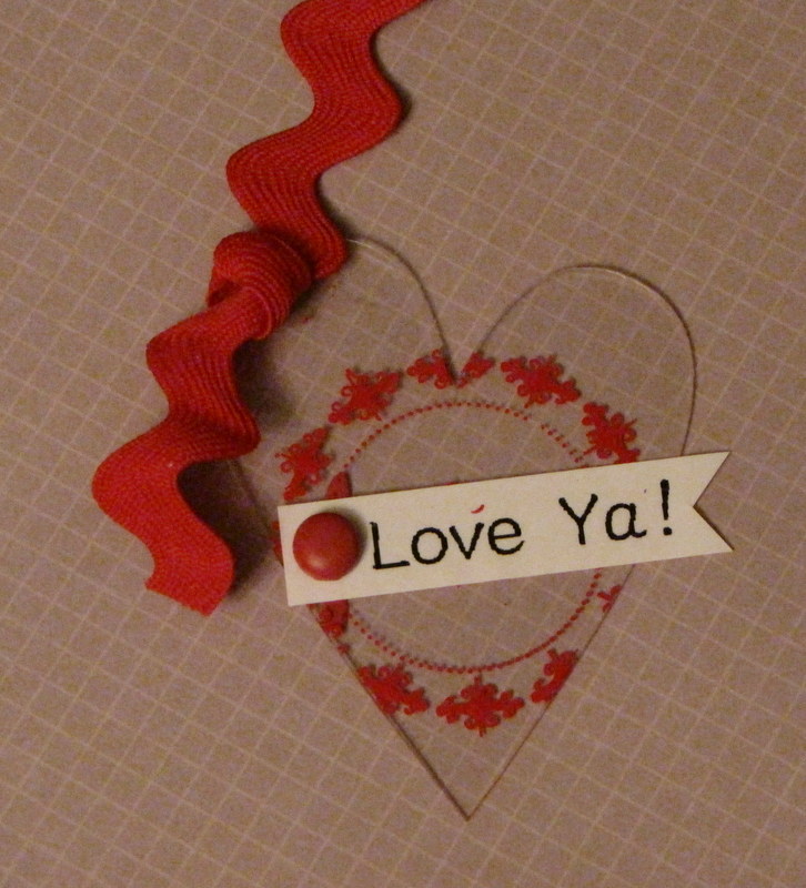 On this heart shaped "Love ya" tag, I used one page from a heart-shaped mini-ornament album (leaving me 4 more pages for future tags and cards). I used a rub-on, a sentiment printed on my Epson Labelmaker (LW400) and a Crop-a-Dile to punch a hole for my brad to go through the arylic. Tied on a ribbon, and Done.