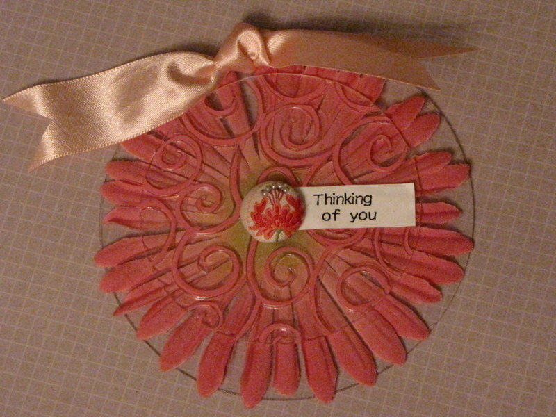 For this large "Thinking of You" tag, I used 2 acrylic circles, sandwiched a large flower in between them, used a paint marker to highlight the embossed parts on the smaller circle (I ran it through my Big Shot with D'vine Swirls folder), and attached another Labelmaker sentiment with a big fabric brad. Done.