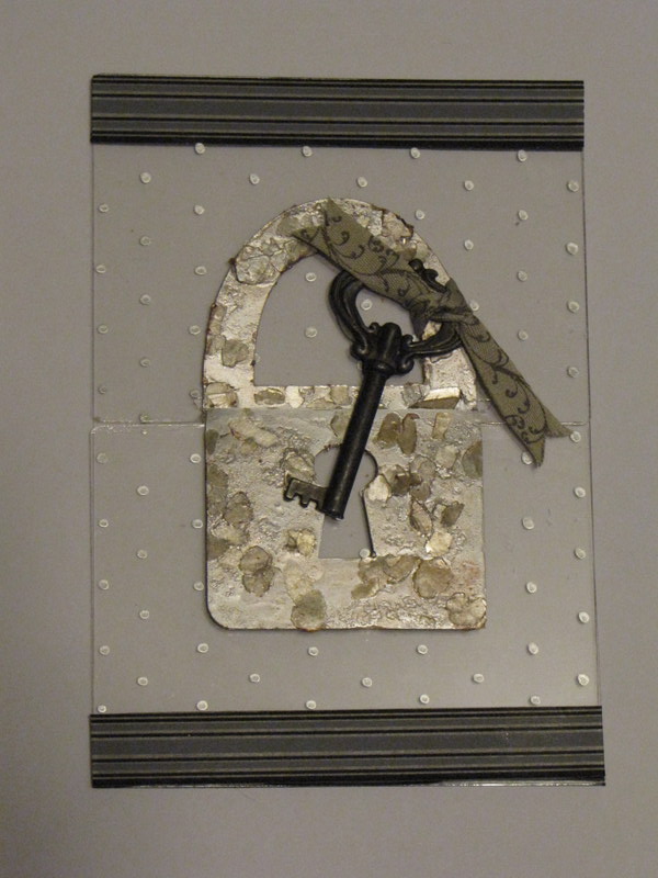 I finished off my card with more silver dots, Washi tape for binding it (in addition to the stickers provided) and also a vintage key hung by ribbon from the frame of the lock. I think I'll add a lovey-dovey "you hold the key to my heart" sentiment or something when Valentine's Day rolls around.