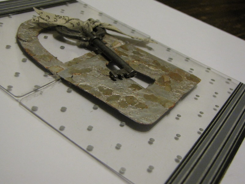 I wanted to heat emboss this lock but that is a really, really tricky procedure and I'd already melted one card this day so I decided to go with Plan B: Silver leafing pens! The paint in the silver leafing pens works great on acrylic and I put a thick enough coat on that it was wet for awhile and I could lay in some of the antique silver Mica chips to give it a more rustic, antique look.