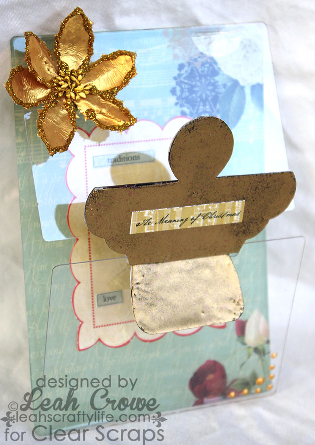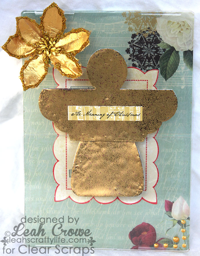 I traced the angel onto pattern paper, cut the angel out, then placed versa mark ink all over and quickly covered her in Stampendous aged gold embossing enamel. I then heat set the embossing enamel, and once cooled, adhered her to the Clear Scraps card.
