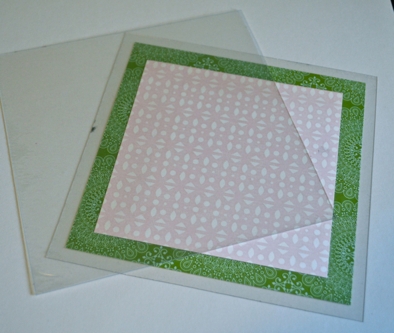 - Peel (BOTH SIDES) off protective coating from bottom layer. Add patterned paper to top of acrylic.