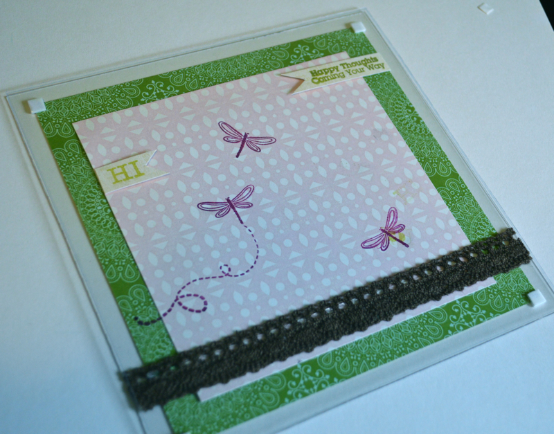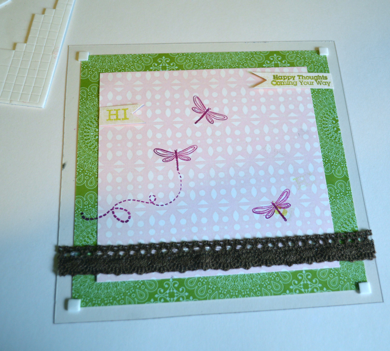 - Lay bottom embellished sheet down, using foam pop dots, place dot in each corner. (Same spot on each corner).