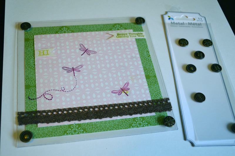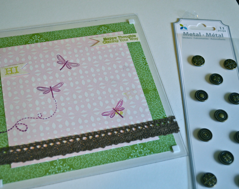 - Using buttons or pearls, adhere OVER foam pop dots (to hide them), I used metal pieces. (Momenta).