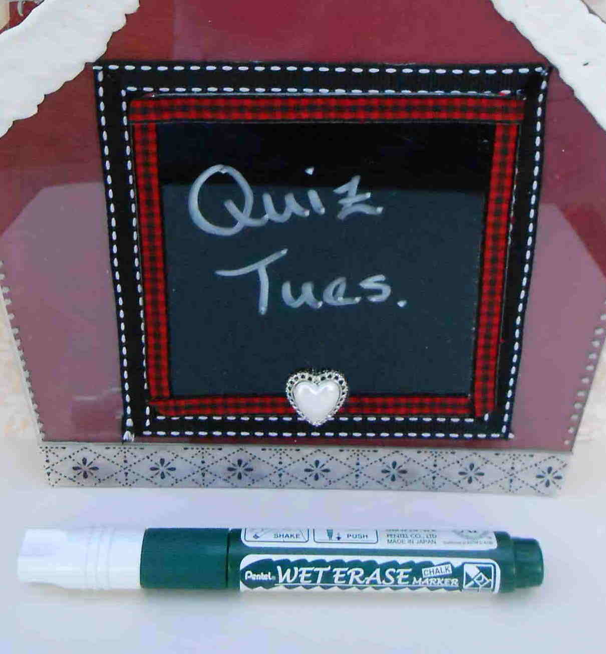 I used a white Wet Erase marker for the message. This wipes off very easily with a slightly damp cloth or paper towel. I have also added magnets on the back so this can hang on the frig or other surface.