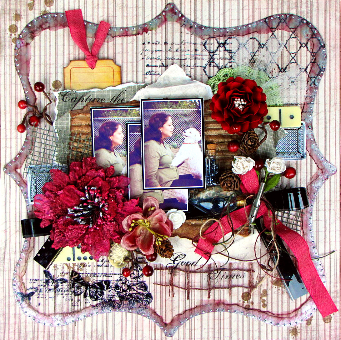 Doesn't that combination of stamping give a fabulous effect? The rest of my page is composed of various elements, flowers, ribbon, twine, trinkets and embellishments. I also included several Autumn themed embellishments since this photo was taken in Autumn–which just so happens to be my favorite season!