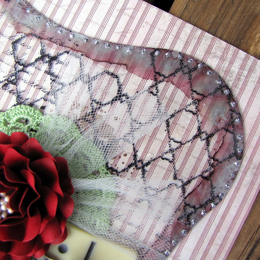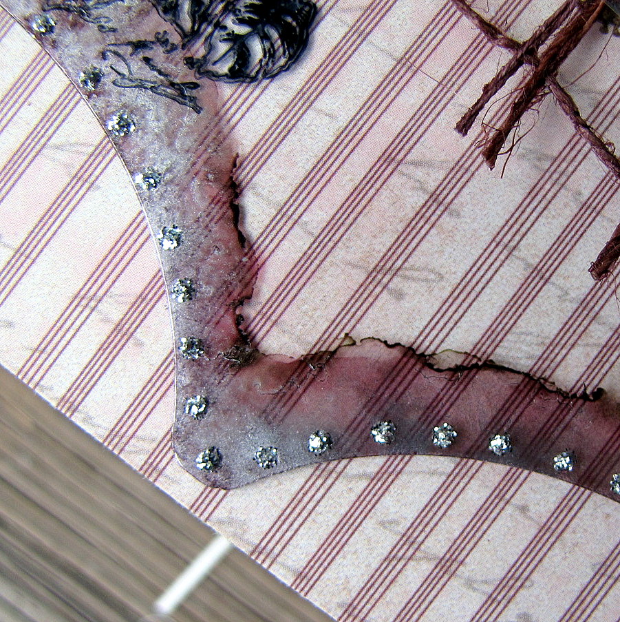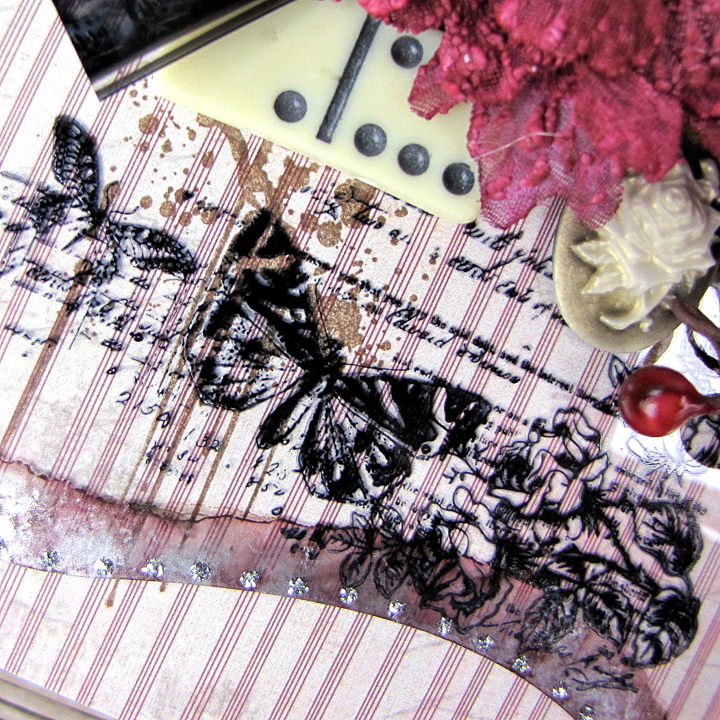 I also did a bit of random stamping with splatter stamps on my background paper. That's the beauty of acrylic…you can stamp either right on the acrylic or on paper behind it–either way your image will show through. In this close up you see both types of stamping…the black image is stamped right on the acrylic and the brown splatter stamping was done on my background paper.
