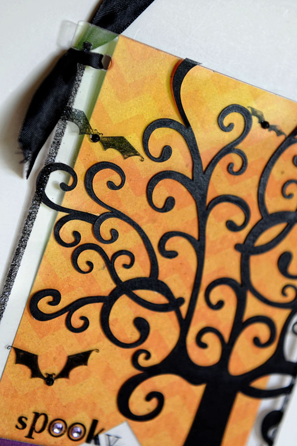 Happy Thursday everyone! Tonya here today to share a fun Halloween project with you. I started by taking out one of the banner pieces from the Clear Scraps from the Large Pennant Banners package. The "spooky" tree is a laser diecut from Quick Quotes called Whimsical Tree. The orange zig zag paper, the purple paper that the ribbons are made of, and the hint of striped paper are all from the Quick Quotes Halloween paper pack.