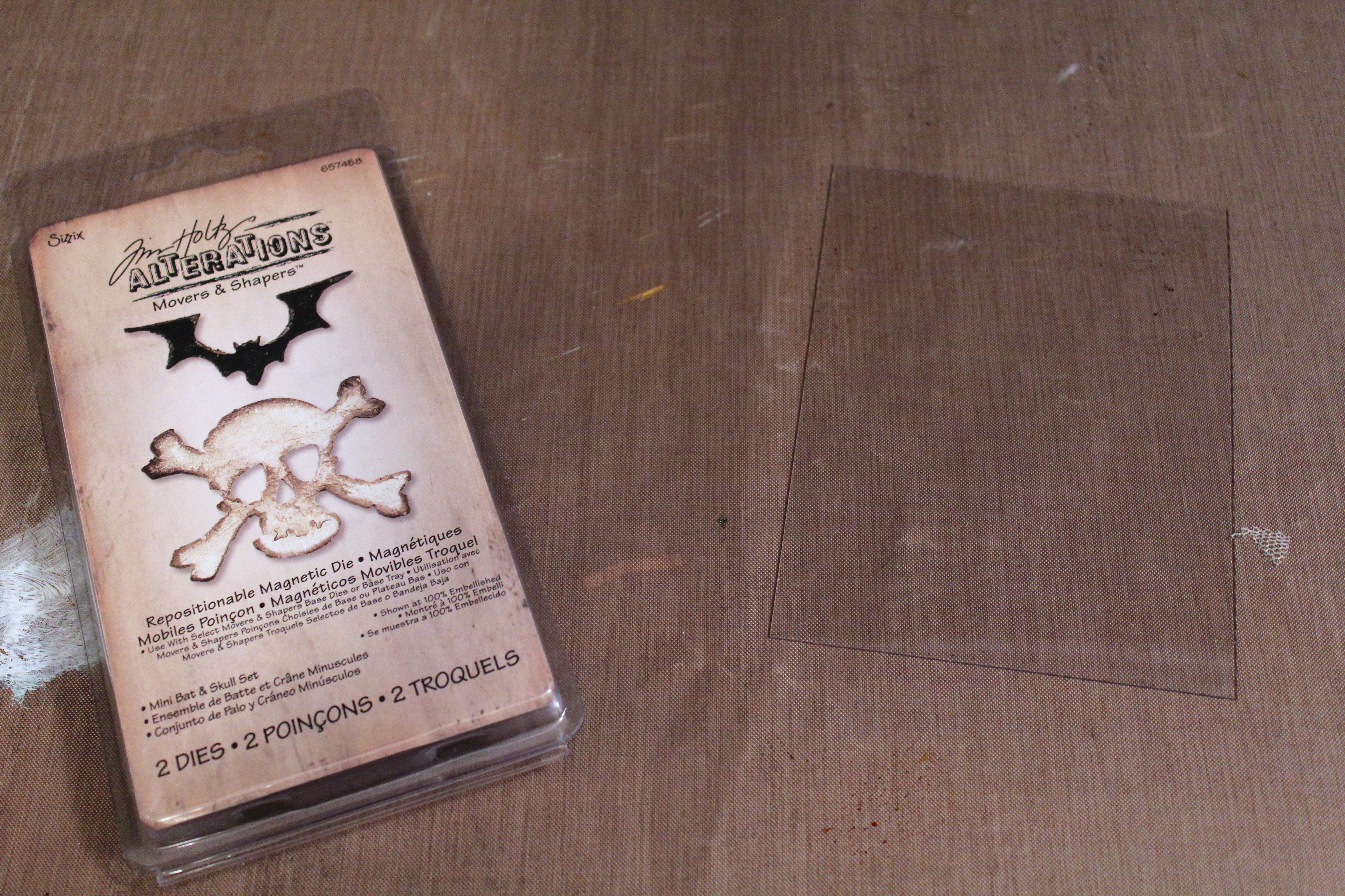 For my layout, I first cut a 4×6 piece of acrylic to use with the Tim Holtz Movers and Shapers Mini Bat and Skull die.