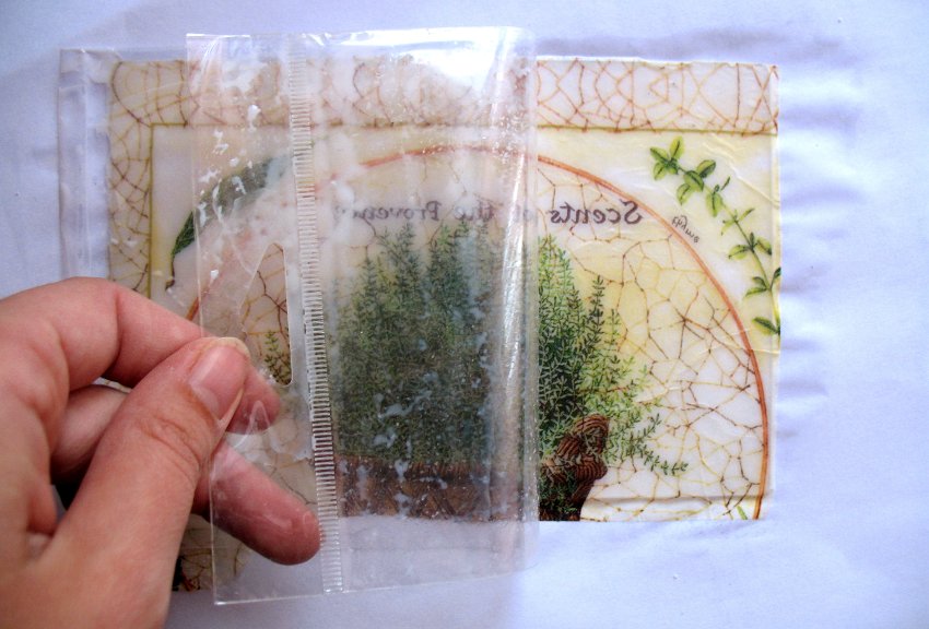 Your next step is to remove the plastic carefully, avoiding tearing  and lifting of the serviette. If it happens, just smooth it again with your brush and glue