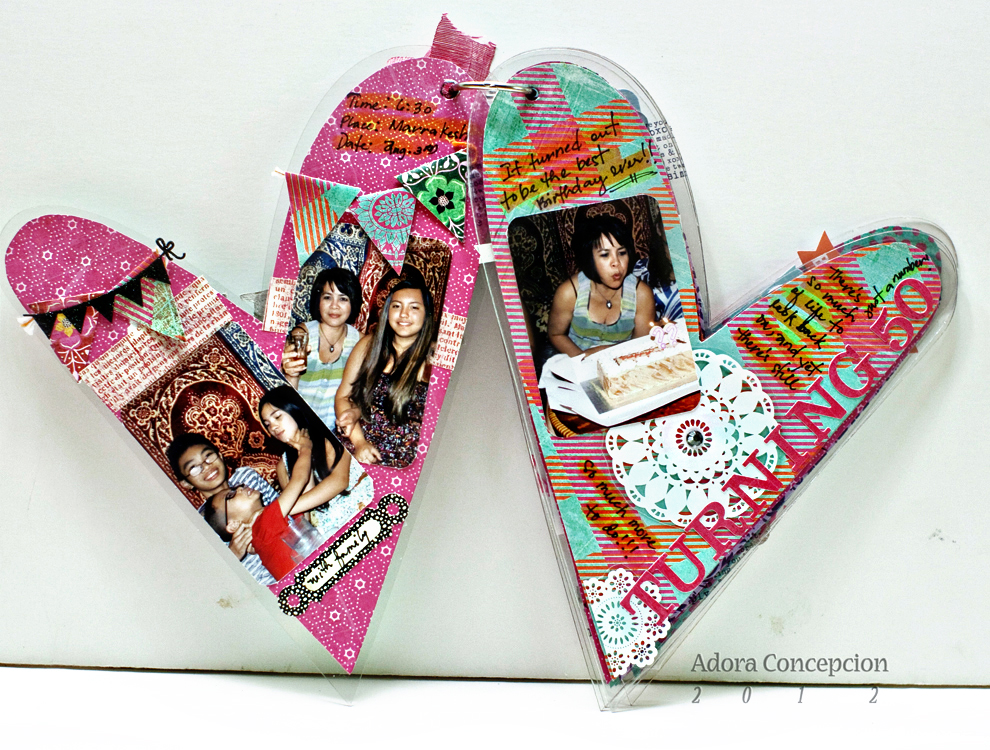 I trace the heart on my patterned paper and cut it an inch smaller. I love to show the acrylic base on my pages.