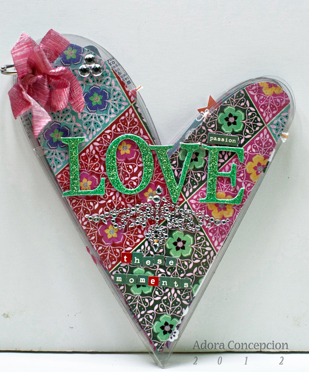 Supplies used: Clear Scraps Acrylic Heart Album, Basic Grey Paper, Unknown Glittered Chipboard Alpha, Mary Arts Ribbon, Ki Memories & 7Gypsies stickers.