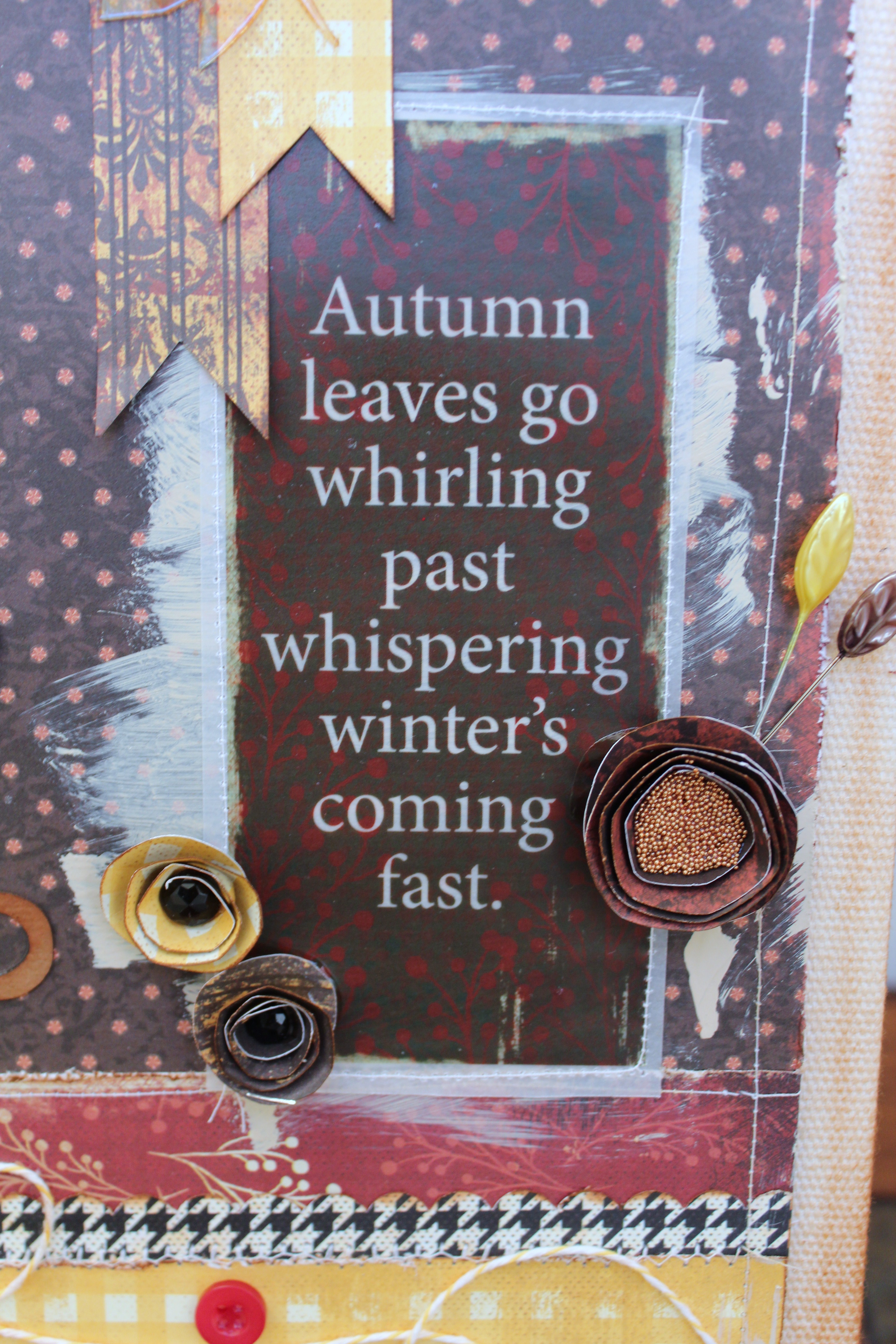 My next step was taking beige-colored acrylic paint to the edges of the paper and canvas. I also placed a large amount where I wanted Autumn Leaves Vellum Quote to be. I stitched around the quote and added paper rosettes and decorative leaf pins.