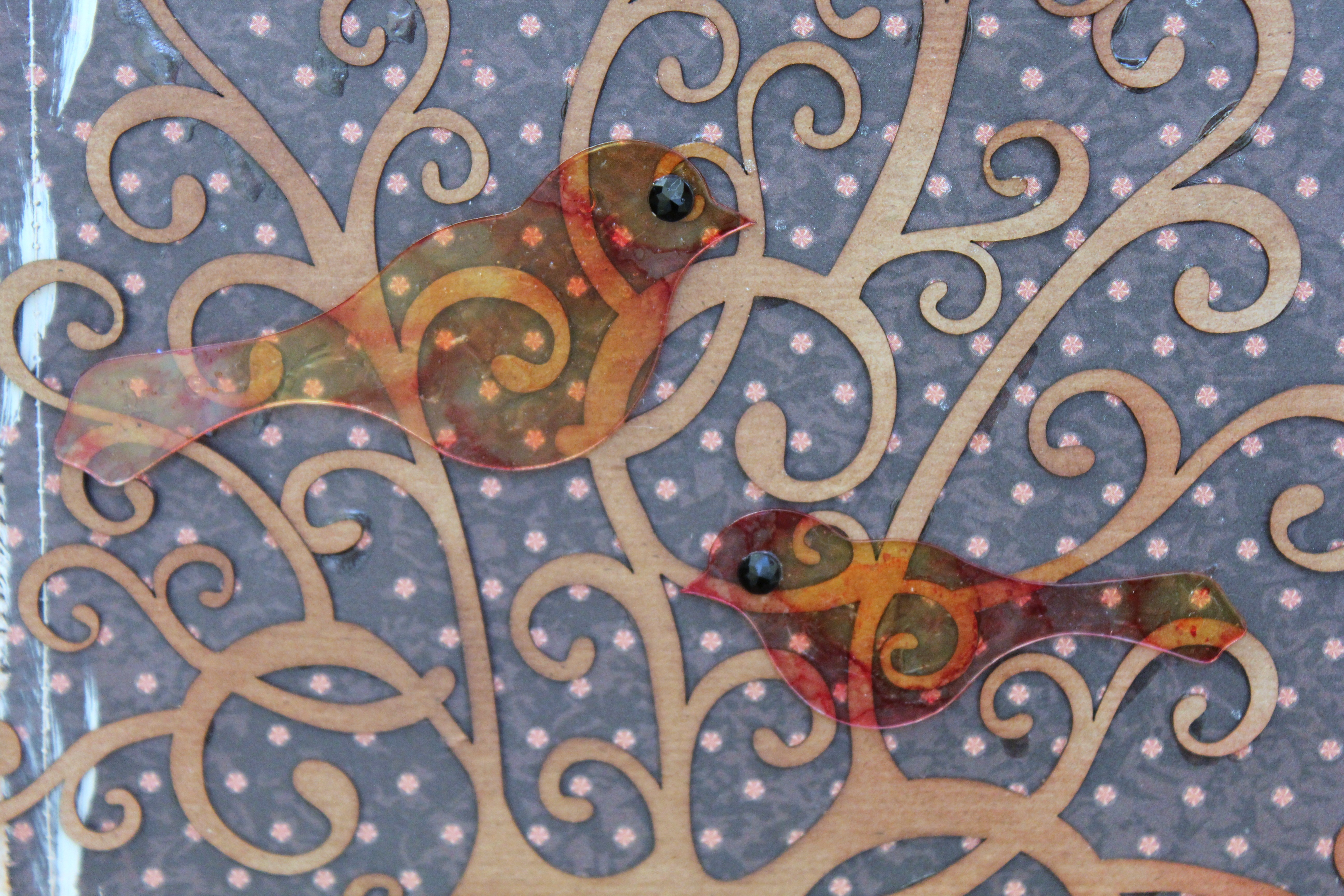 Next, I adhered the Quick Quotes Whimsical Tree to my canvas after inking with the Powder Puff chalk ink. I took alcohol ink and colored the two birds from the Clearly Accent Birds and Cage Embellishment. I adhered the birds to the tree using liquid adhesive and added black rhinestones for the eyes.