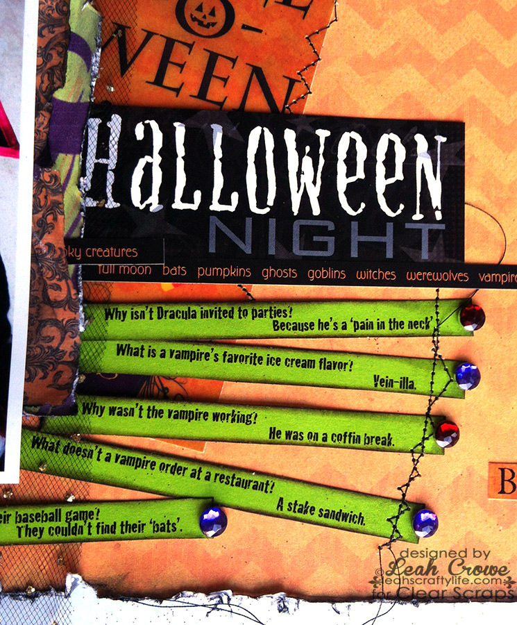 I also added machine stitching in several places on this layout. I especially love the area with the cute Vampire Halloween jokes.