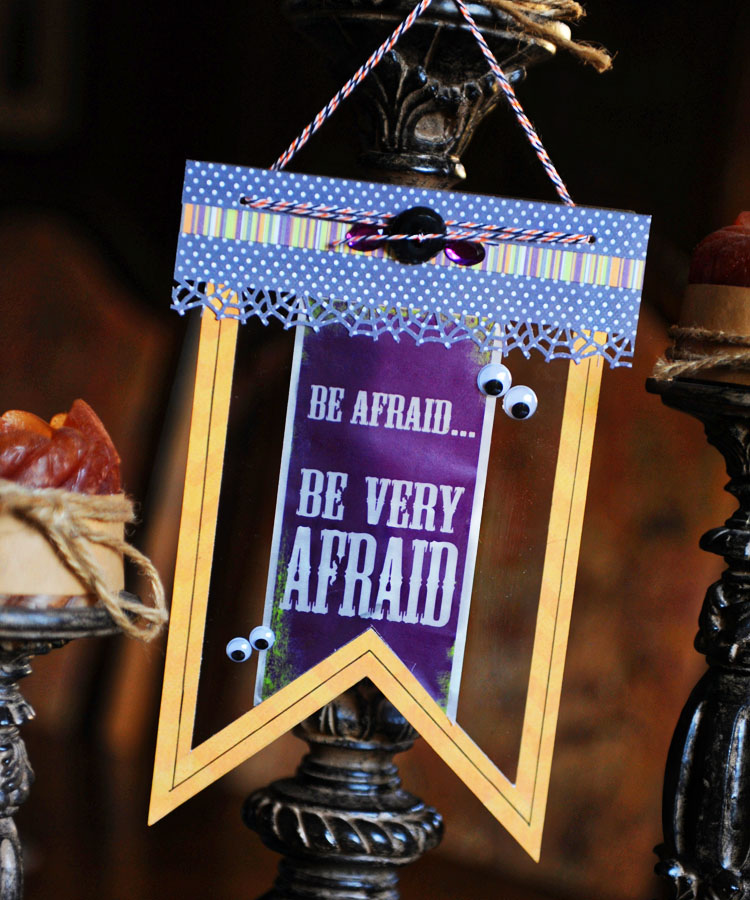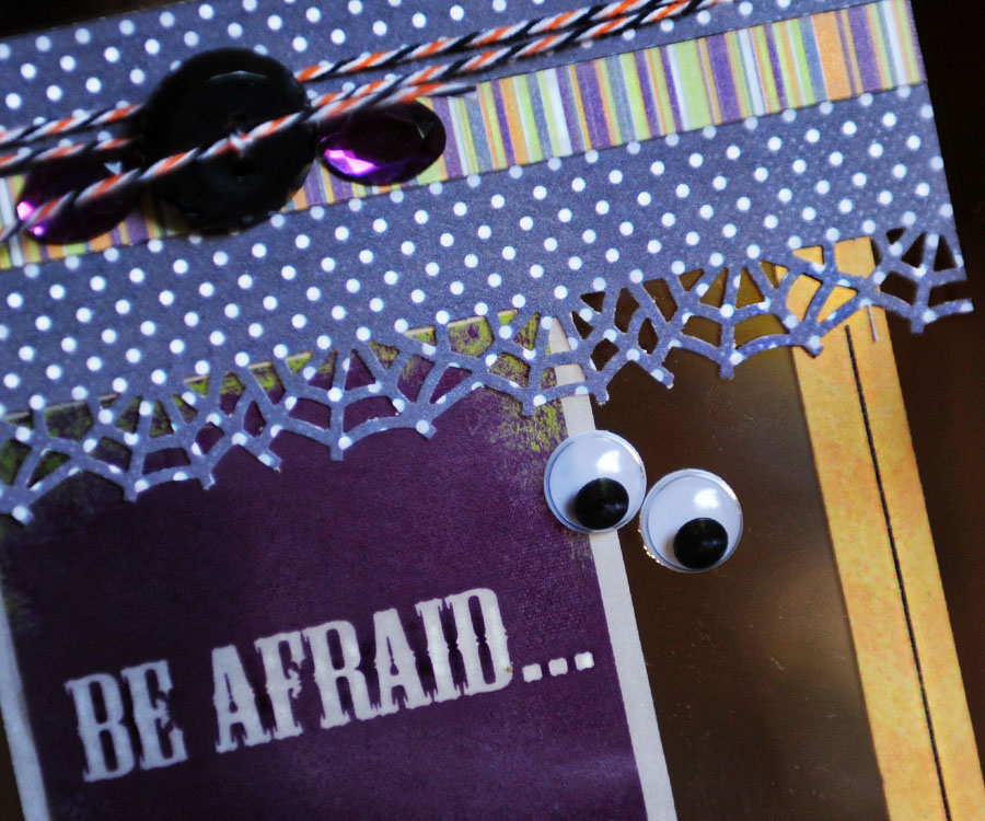 I started by cutting a piece of the orange zig zag paper to go around the border of the acrylic pennant base. Then I used a Martha Stewart spider web punch on the grey polka dot paper and added a strip of the striped paper across the middle. I adhered one the Quick Quotes vellum sayings to the middle of the banner and added some googly eyes for a "scary" effect. Finished it off with some Halloween twine, a button and some jewels.