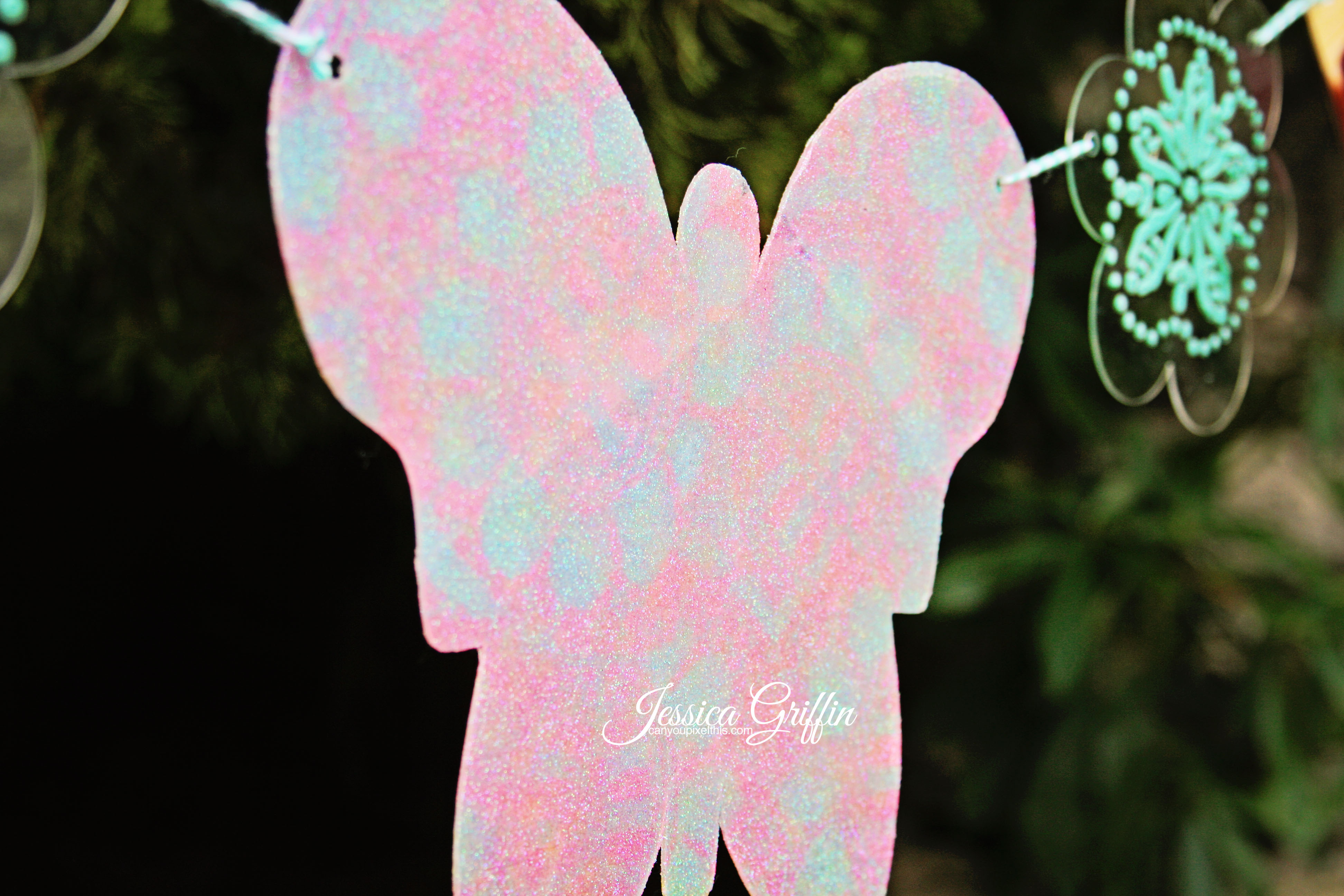 To create the butterfly, you'll need glitter, lace and double sided "Tear-ific" Tape. You'll cover the butterfly with tape, and apply glitter over top of the lace. I like to work in small areas, so I only tear off the top layer of tape when I'm going to work on that area. For this technique you're using the lace as a mask so to speak, and depending on the size of your lace, it may not cover the whole butterfly. For the butterfly here I've used Sunny Daze, Neon Flamingo, and Rapture Blue.