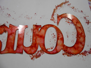 I added a little more Yellow and a little Green to my pad to “brown” the red down and went back over the title again. It was finally getting to be the deeper, warmer colors I was after. What I really enjoy about daubing on the alcohol is watching the way the colors marble. I love that effect!