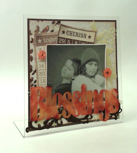 1. Trim pattern papers and mat with cardstock. Adhere papers to back of acrylic book stand.
