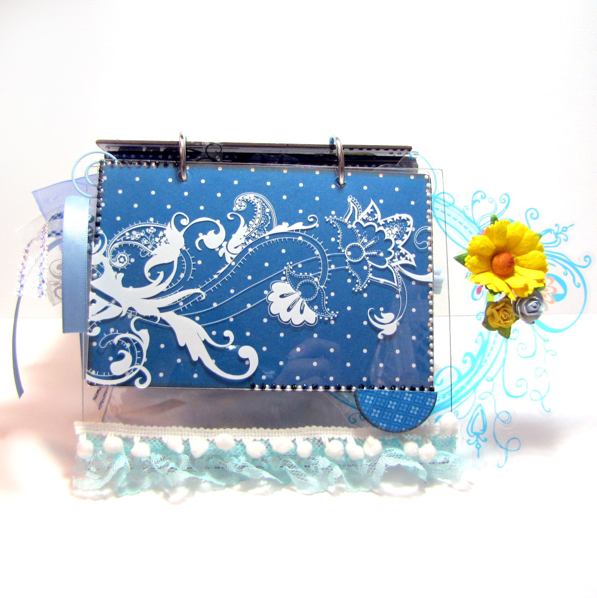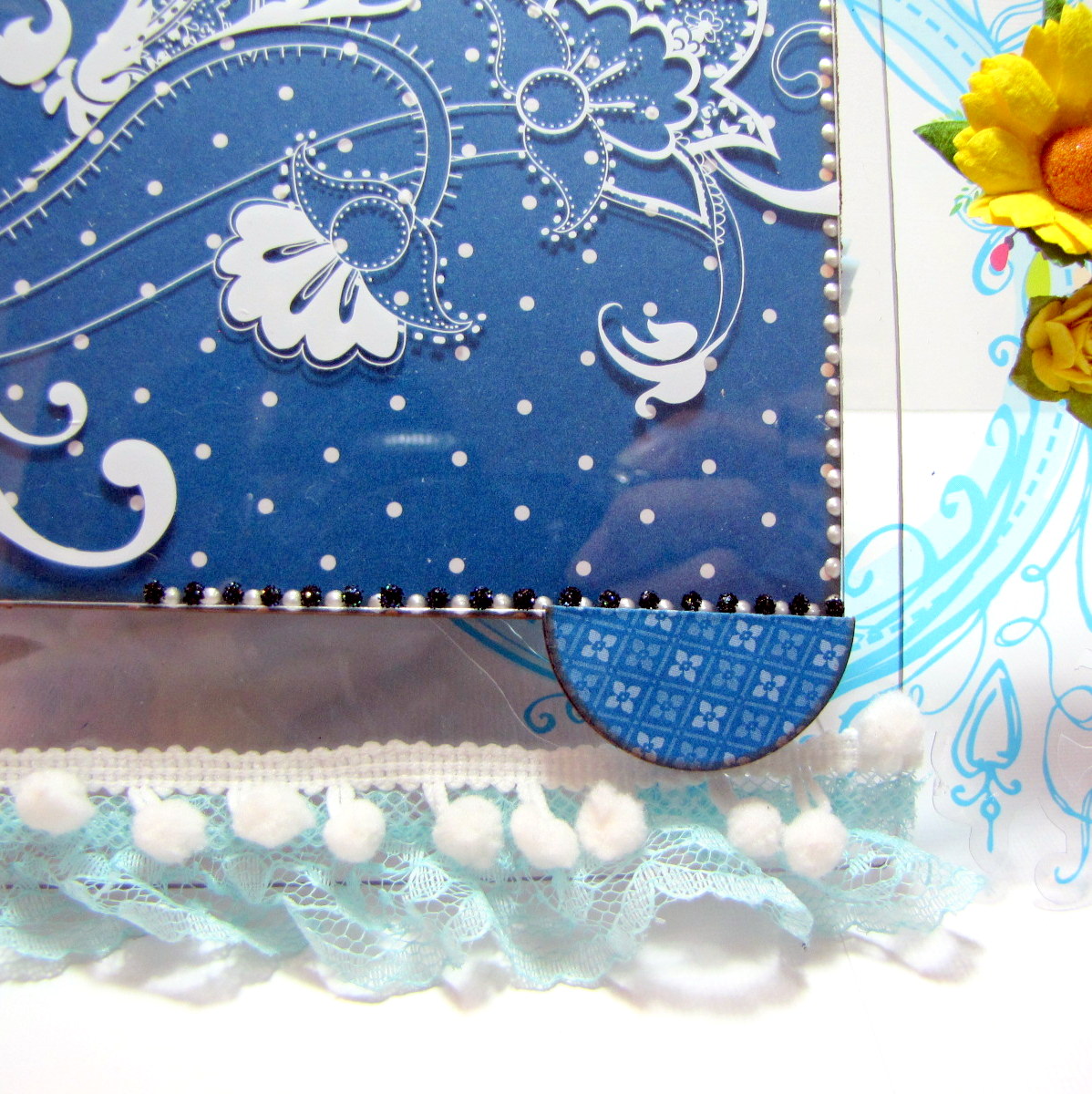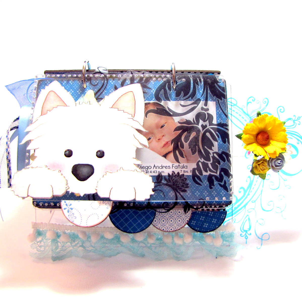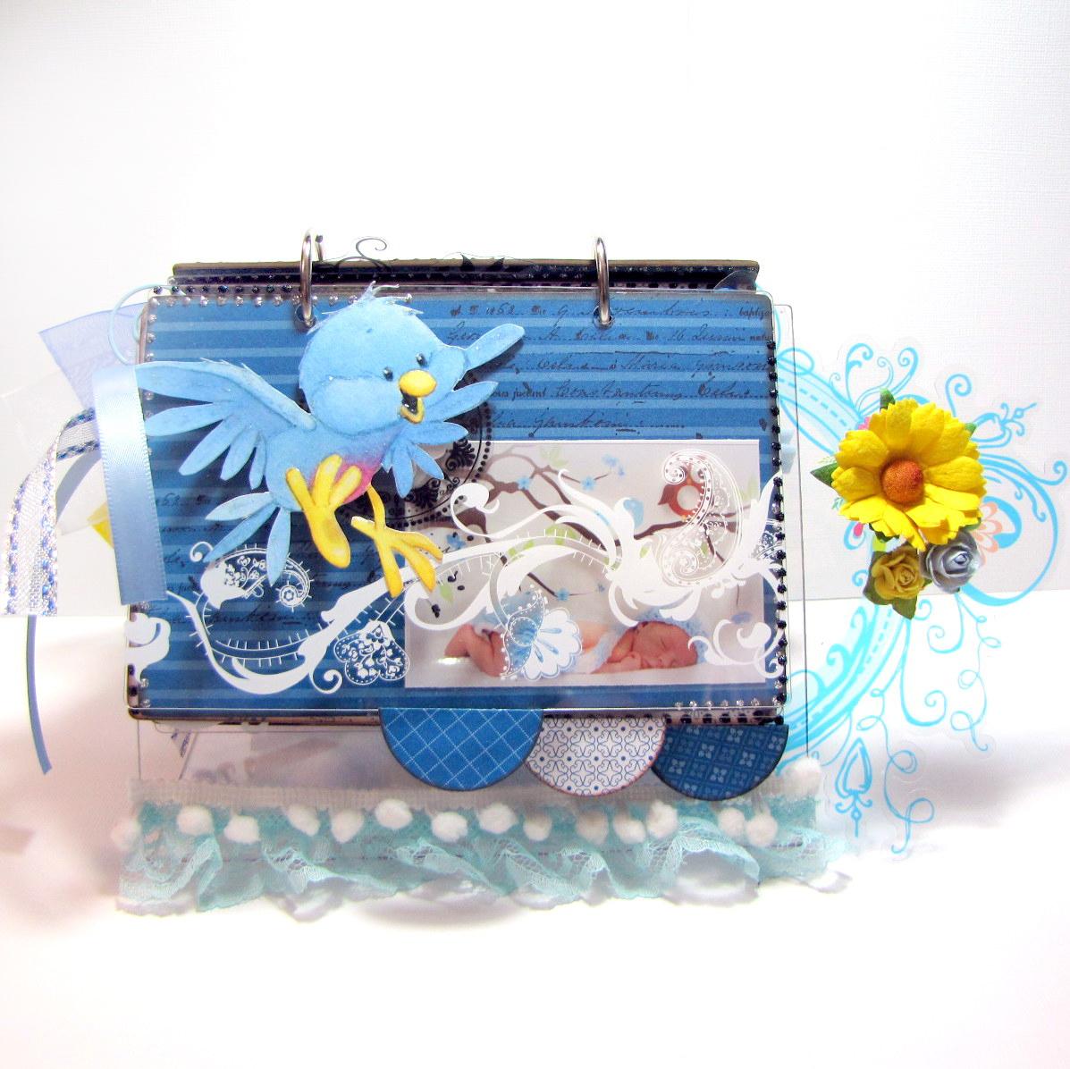 I went with a blue, white & yellow color scheme for my album. As you can see, you can easily add dimension to your album with transparent elements. Don't be afraid to adhere transparent embellishments to go off your page–doing this is what gives your album a dimensional look. I added some light blue lace at the bottom along with a bit of white pom-pom ribbon. For the cover–beaded flowers & mulberry flowers were combined along with strips of ribbon, a small glass vial filled with glass beads, square letter beads spelling out my little guys name & a small yellow teddy bear that I found at my local craft store.