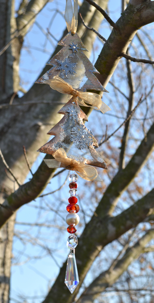 Then I threaded a Crystal Sun Catcher through the bottom and placed a gold bow over. Not only is it a great sun catcher but it is 2 sided and perfect for the holidays.