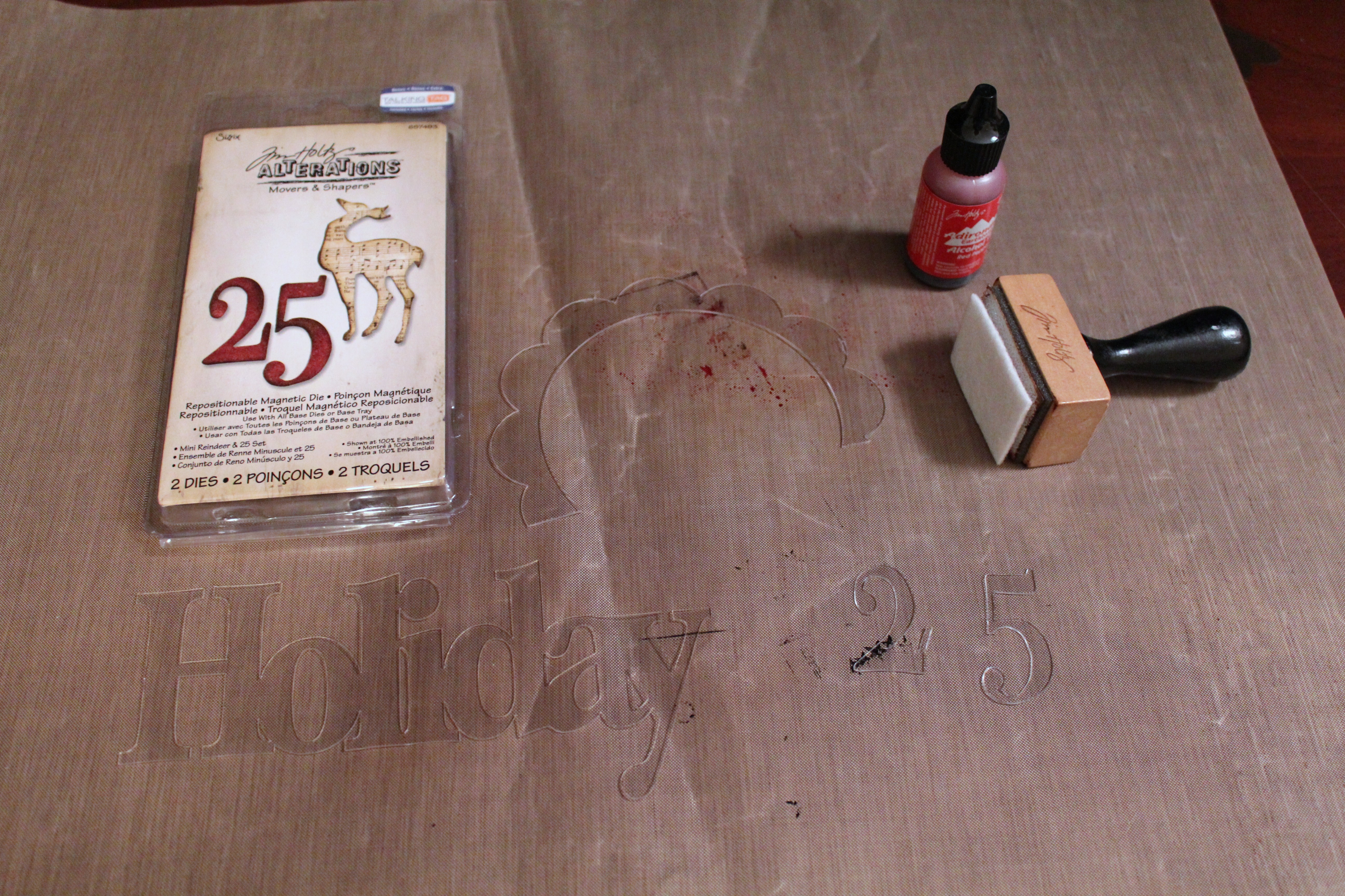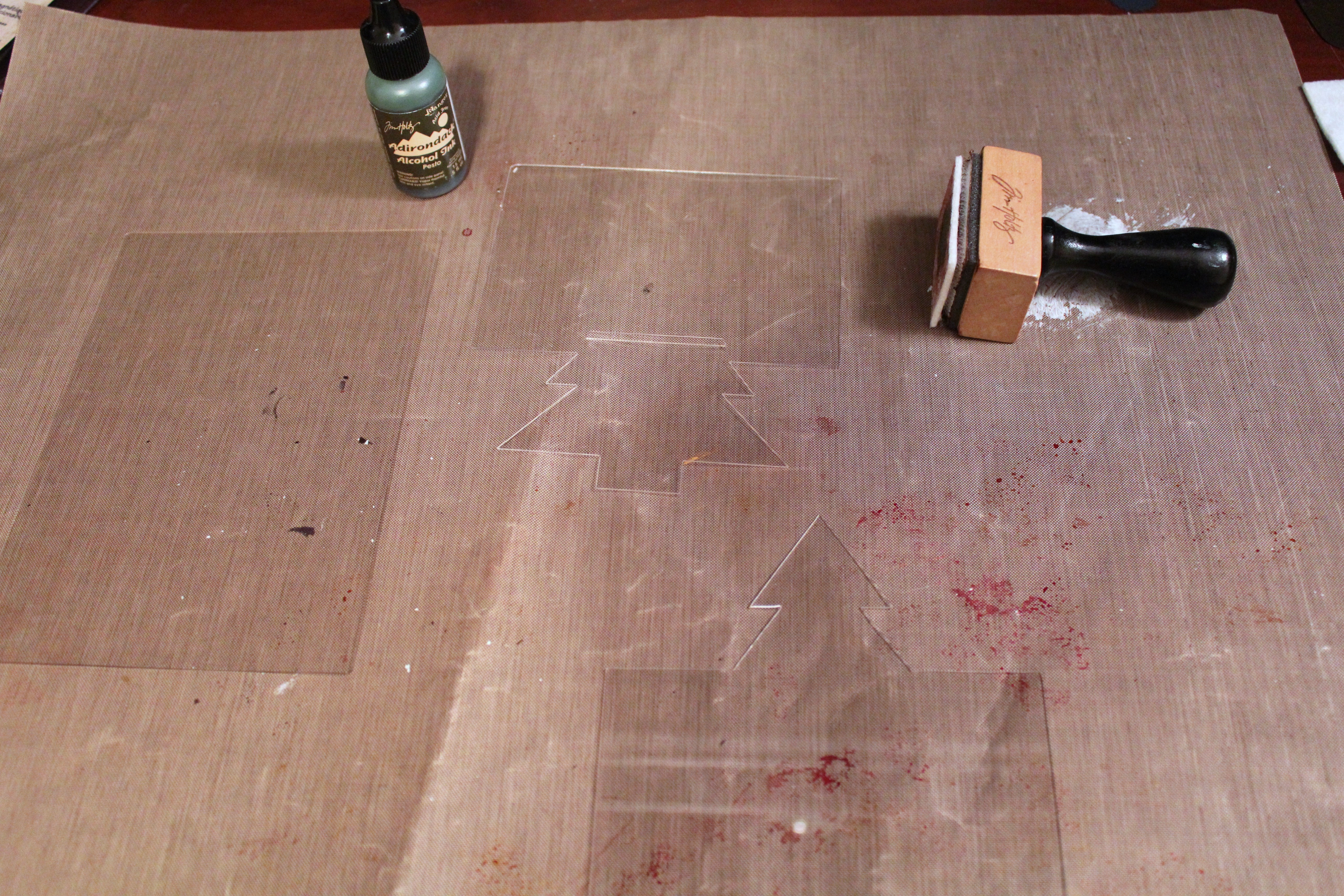 After removing the protective film from all of the acrylic pieces, I colored each with Fired Brick Alcohol Ink.