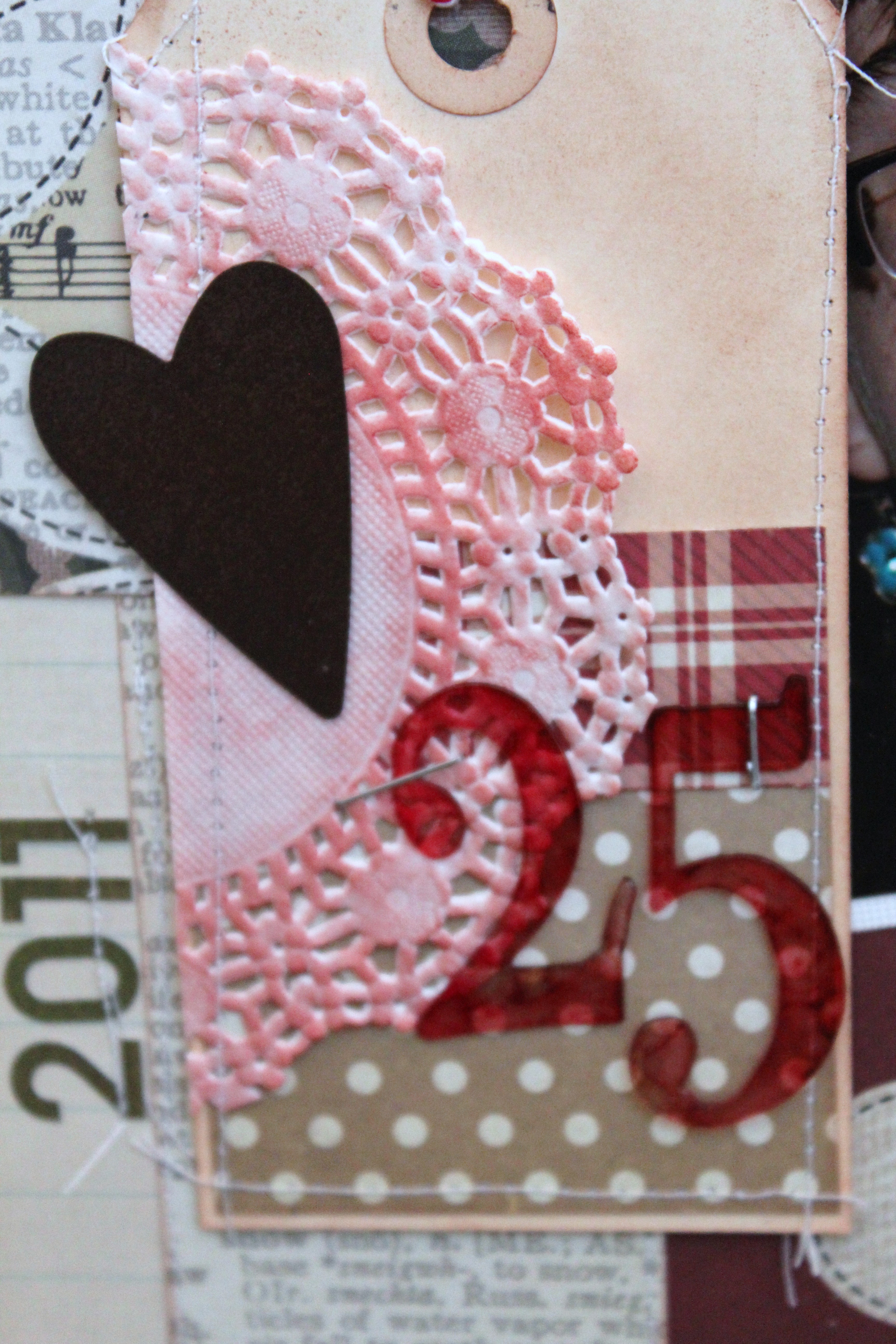 Additional products used:  patterned paper and cardstock stickers: Simple Stories; bakers twine: Divine Twine; inks staples, and manila tag: Ranger Ink; misc: star pin, thread, rusted heart, doily.