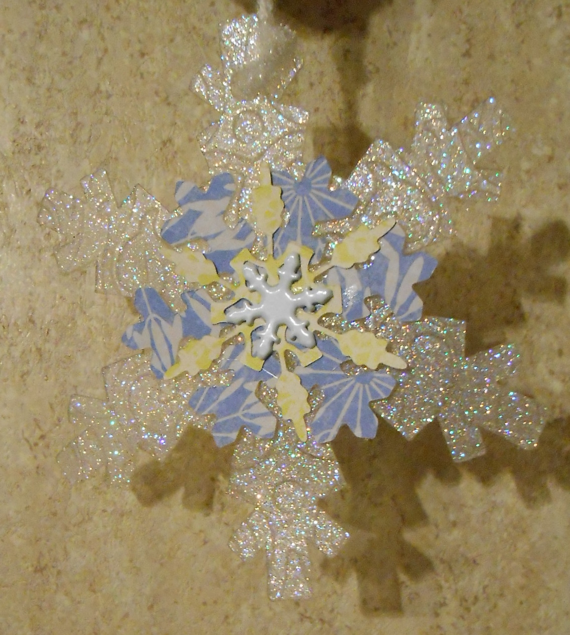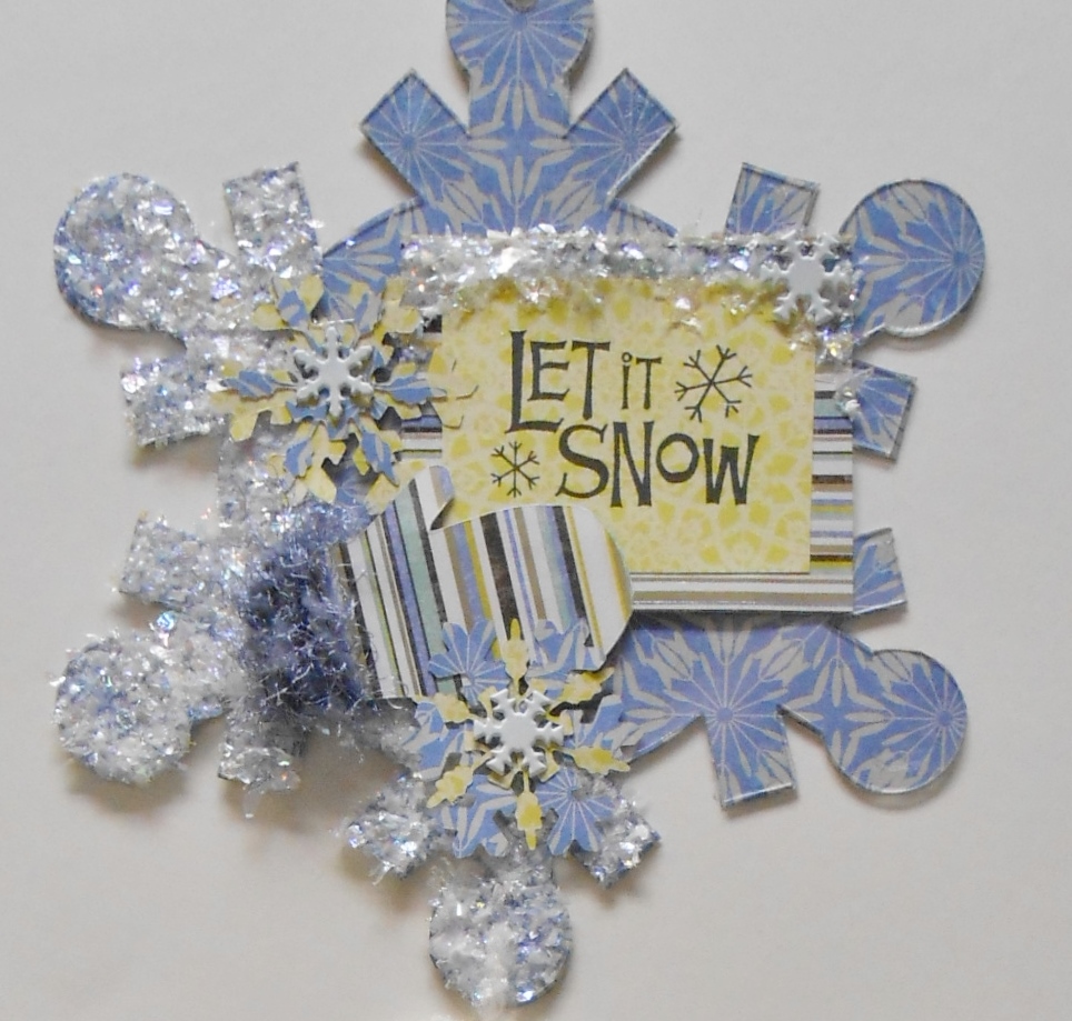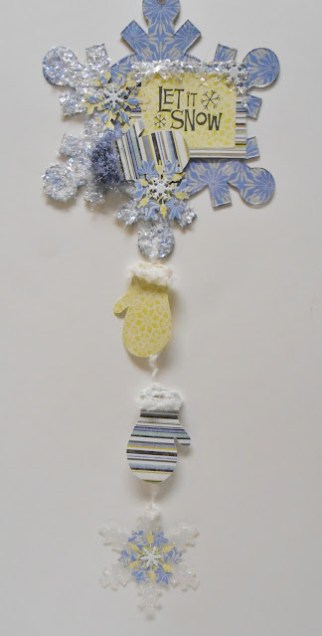 The snowflake that hangs at the bottom was embossed by running the acrylic snowflake through my Sizzix Big Shot in an embossing folder. Then I sprayed it with Helmar Vellum Spray adhesive and dusted with glitter. The Vellum adhesive gives the acrylic a frosted look. Embossing gives it a great crystal snowflake texture.