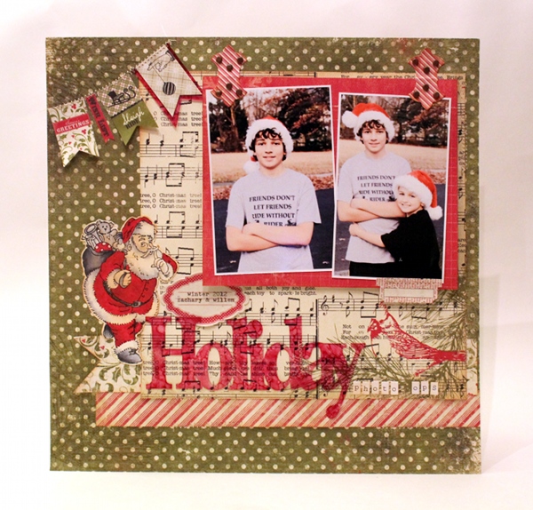 6. Adhere banner stickers, acrylic pennant and acrylic “holiday” expression to layout.