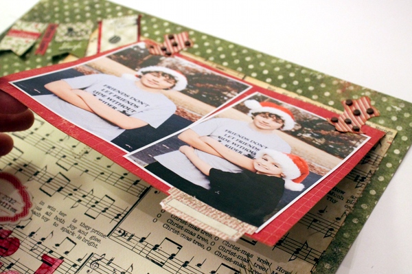 3. Using hinge stickers and brads, create a hinged flap for photos and to hide journaling under.