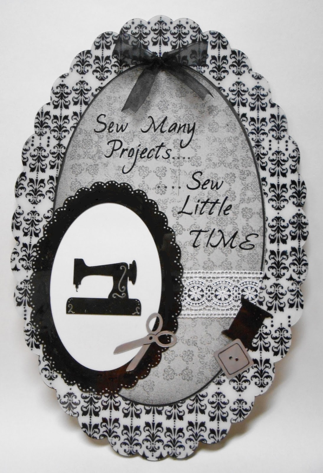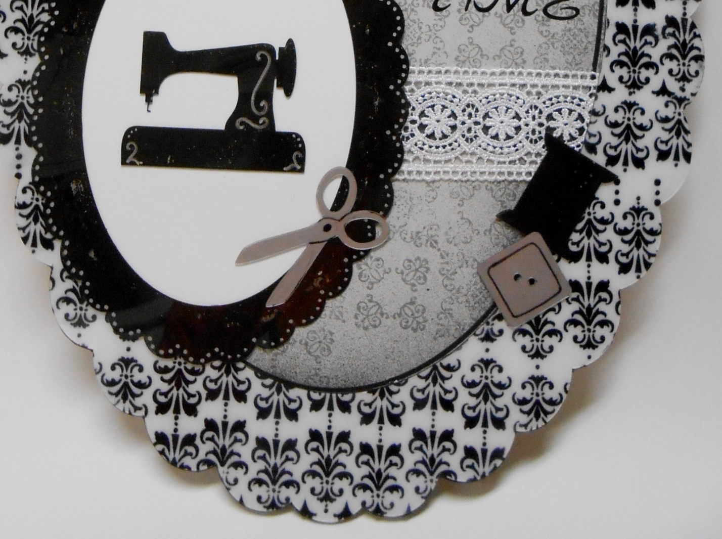 The medium frame was painted black on the back and then I dotted the edges with a silver Sharpie to look like a black lace edge.  The sewing notions are from Clear Scrap's Clearly Accent Embellishments.  They were colored from the back side using black or silver metalic Sharpies and then details were added to the front using the Sharpies as well.