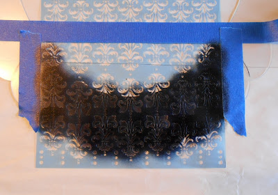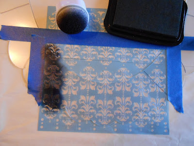 Begin by taping the stencil in place with painter's tape.  Tape carefully along the edges to protect your surface or background.  For this projected I used black Stazon ink and a dauber to pounce the ink onto the stencil.