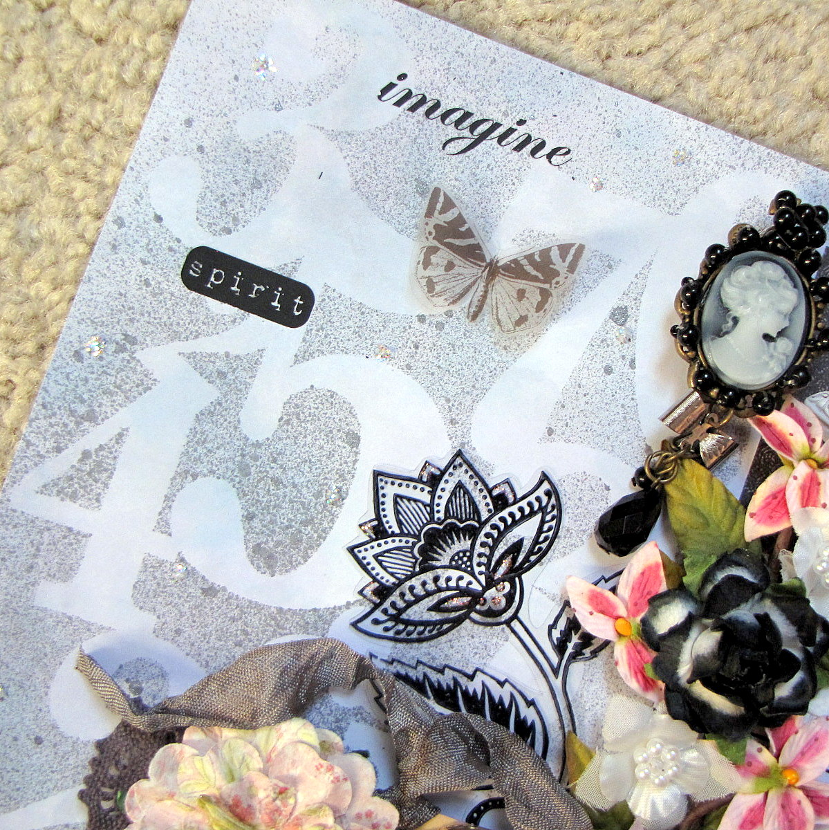 Creating a unique background for any project is a cinch with these new mascils. To create mine I simply placed my mascil onto my paper & spritzed Granite Glimmer Mist onto it, then removed the mascil & voila! I was done! Instant fabulous shimmery background!
