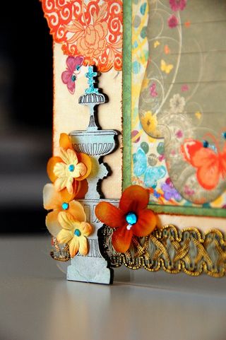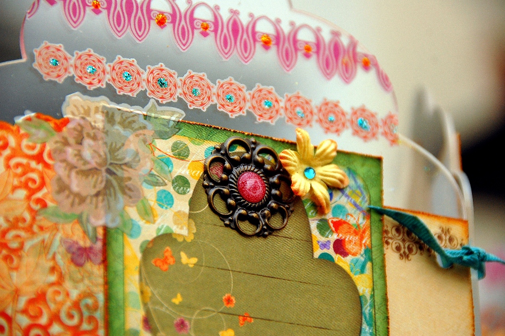 I've used some rub-ons, stickers, chipboard pieces and trims to embellish it. (Tip: to keep more glossy surface on the front of your project, stick your pattern papers from the back of your acrylic.)