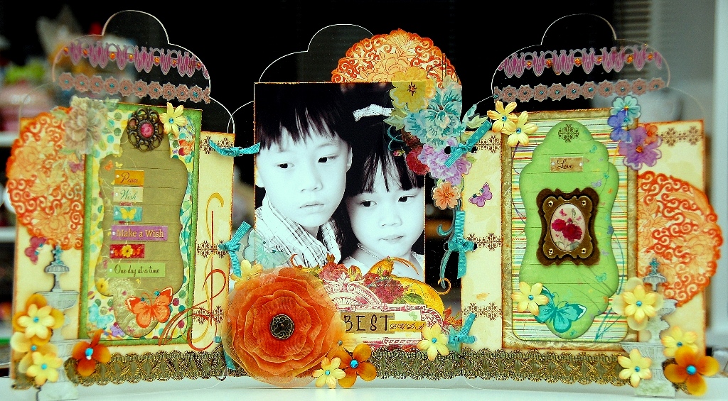 I've created this home decor piece using Clear Scraps tri-fold scallop frame with Bo Bunny's Ambrosia collection. The cast acrylic makes this a very sturdy tri-fold frame that you can display anywhere in your home.