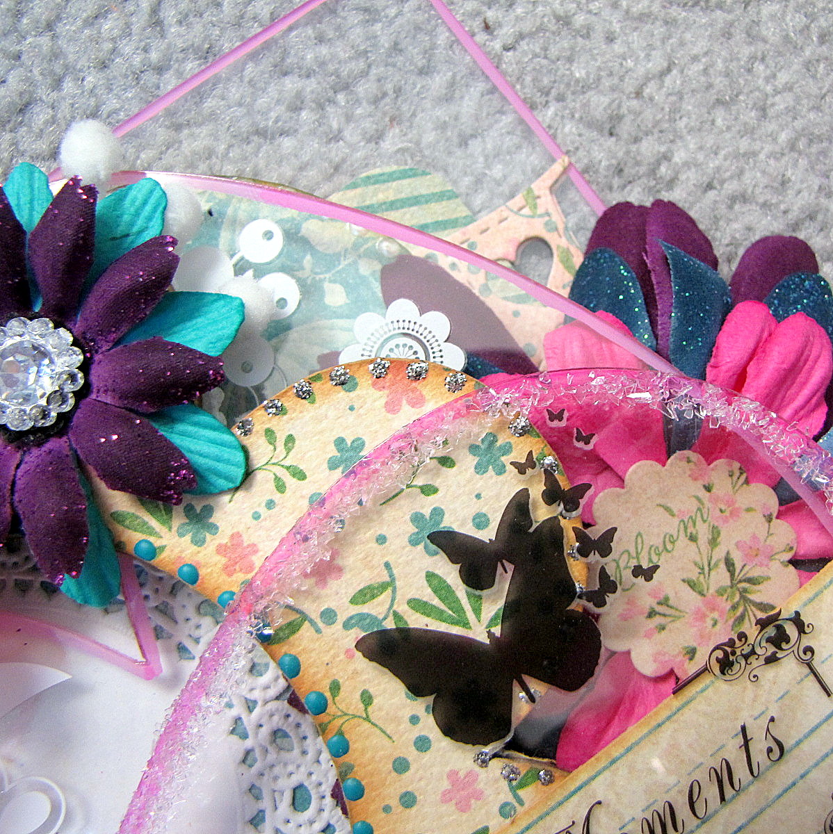 In this close up you can see how the several layers of techniques, textures, chipboard & acrylic all combine beautifully to create this album. To highlight the border of the cover I first outlined the edges with a pink Sharpie oil based permanent maker. Next with a thin paint brush I went along the edges with a dry clear adhesive. Finally, I poured Diamond Dust glitter onto the adhesive & allowed it to dry. When dry, you get this glittery border that defines the edges beautifully.