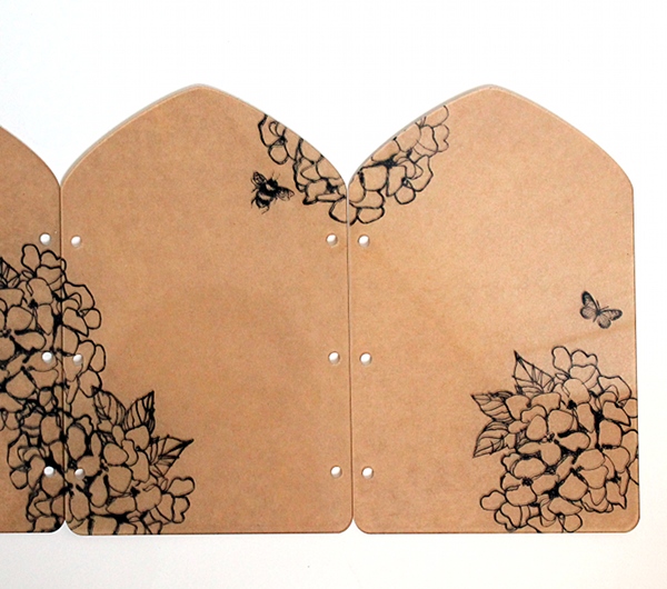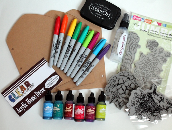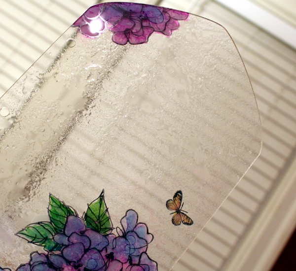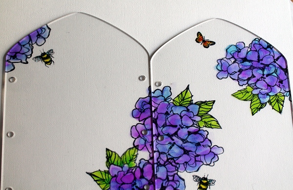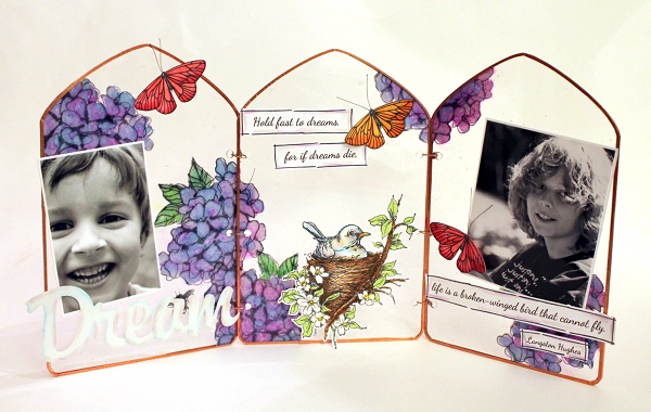 2. Remove protective covering on the other side of the acrylic trifold. Using Sharpies or Alcohol Inks, color in stamped images on the back side. Sharpies or alcohol inks will react with StazOn so be sure to color on the opposite side.