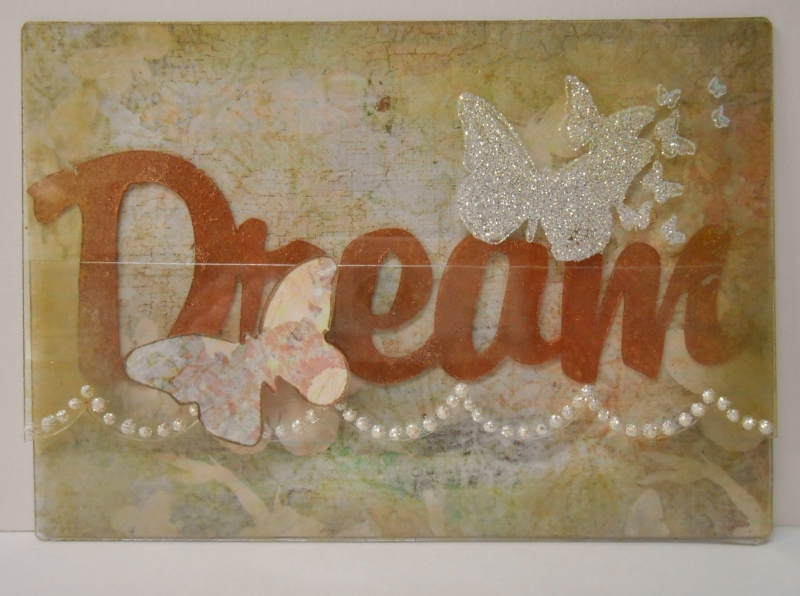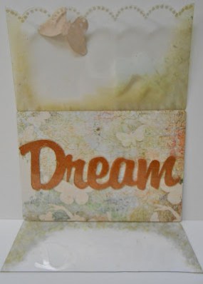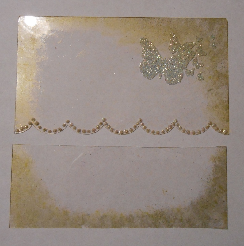 The front of the card was decorated with a butterfly stamp that I stamped in Stazon Opaque White and then dusted with glitter while the ink was still wet. The scalloped border was done with Viva Decor Pearl Pen which was also dusted with glitter while it was still wet. A mix of silver and gold alcohol ink was used around the edges of the two front pieces.Related articles