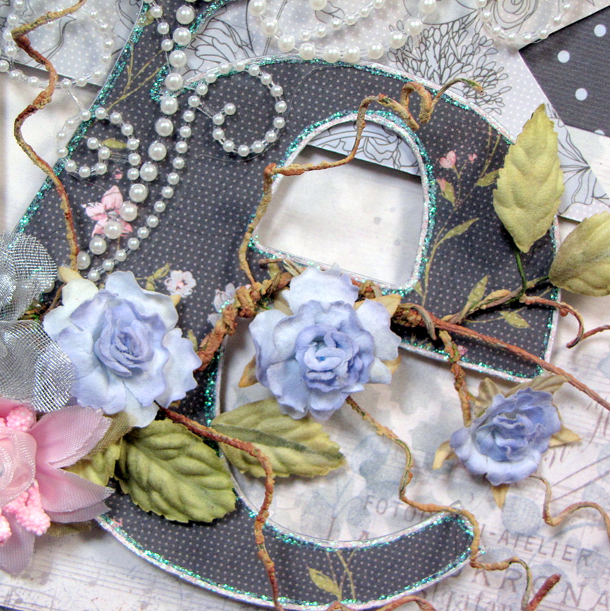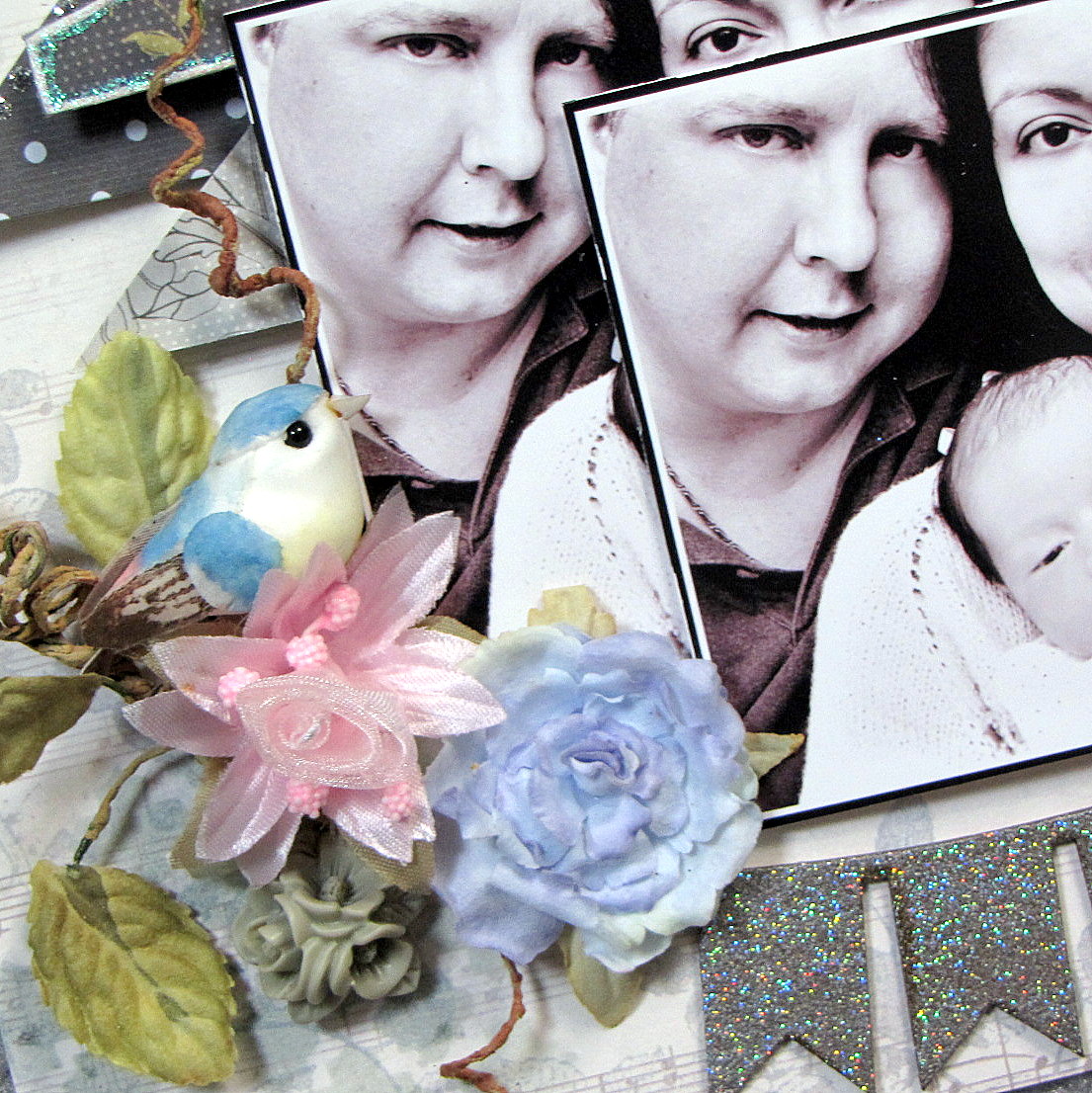 I cut the large acrylic title between the 'O' & the 'V'–so basically I cut the word 'Love' in half. Next I covered all the letters with designer paper. I sanded down all the edges of the letters in order to smooth them out. Finally I highlighted the border of each letter with a white gel pen and a bit of Star Dust Stickles.