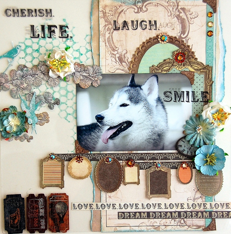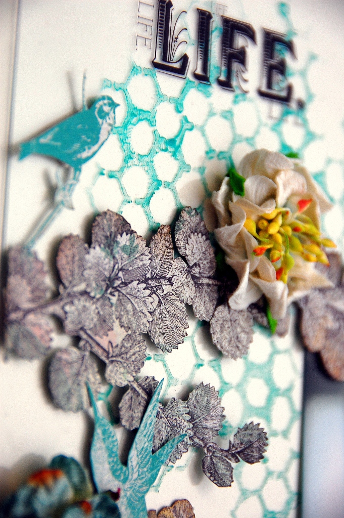 To create more interesting effect to this layout, I've stenciled some patterns on the acrylic sheet using a stencil and some acrylic paint. You can also use solvent ink, alcohol ink or some permanent glaze. I would suggest to use a sponge when stenciling. This will give you a more even and better image. (Tip: It takes a little time for paints or inks to dry on acrylic)