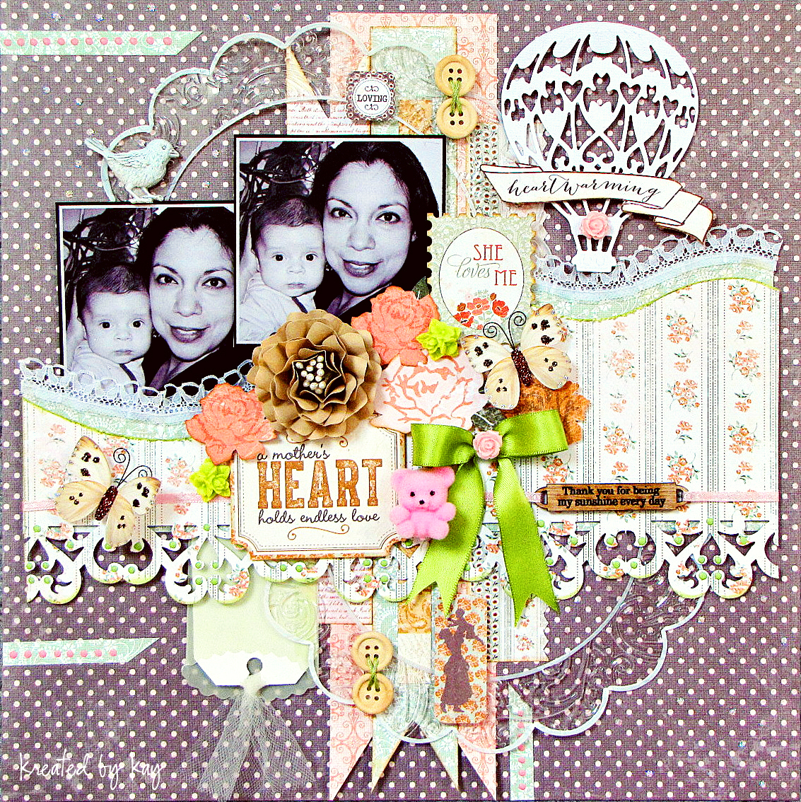 Good morning fellow crafters! Kay here with my latest layout where I'm honoring the very special relationship between a mother & child. With Mother's Day only two days away, I felt that this was the perfect time to create a page with me & my son.