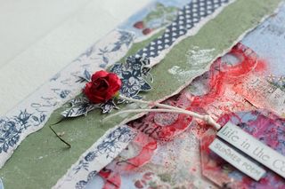 To add more transparency, I colored the tag from Mini Tag Album with alcohol ink, adheed the patterned paper and stamped on the tag.