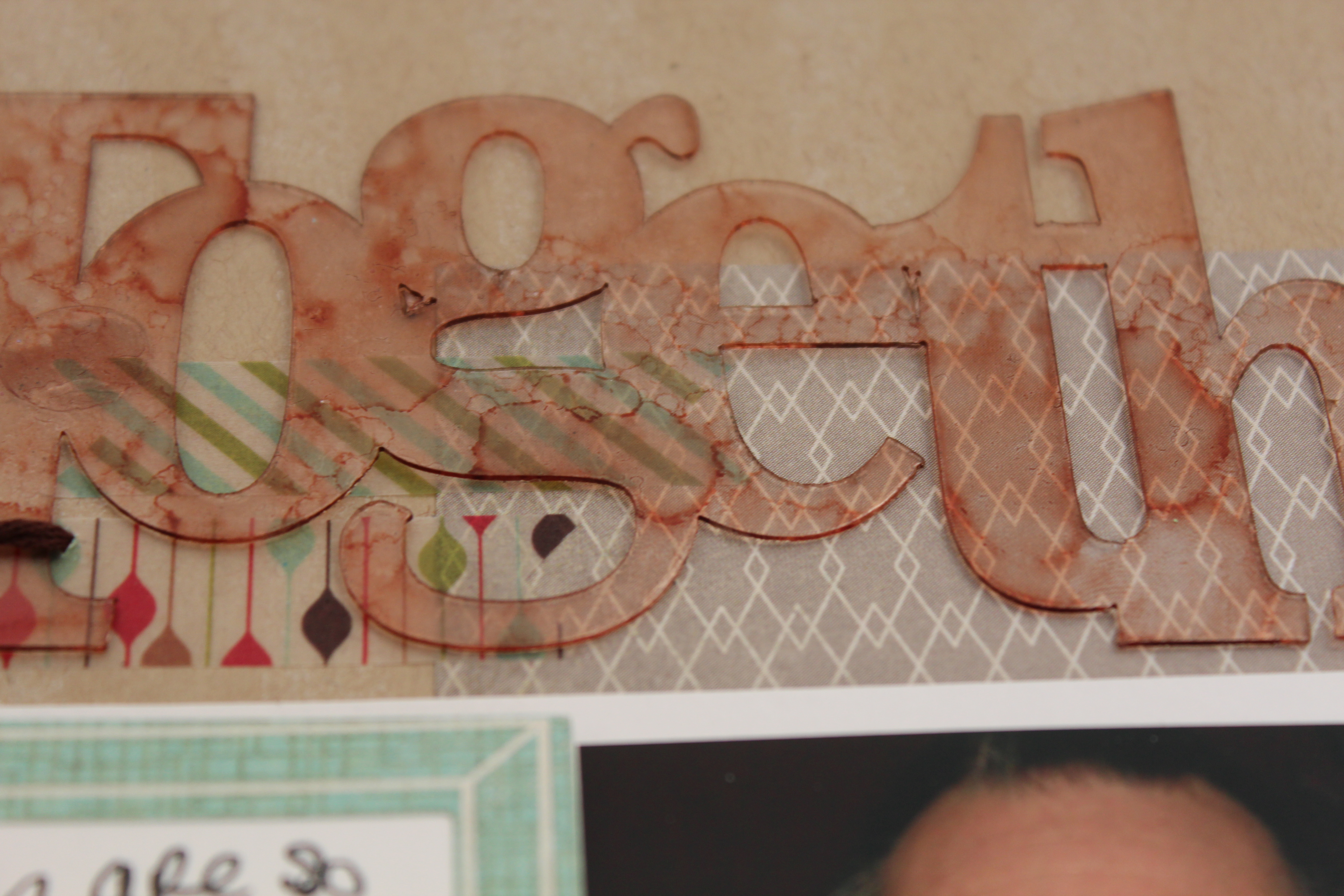 While waiting for my cardstock to dry, I colored the Together Expressions Clear Word Title with Ranger Alcohol ink in Rust before adhering it to my layout.