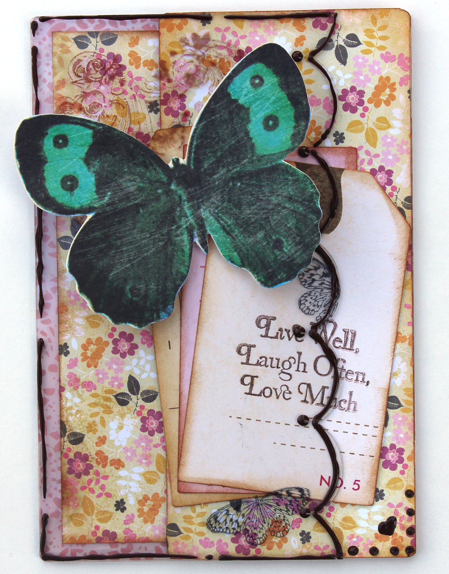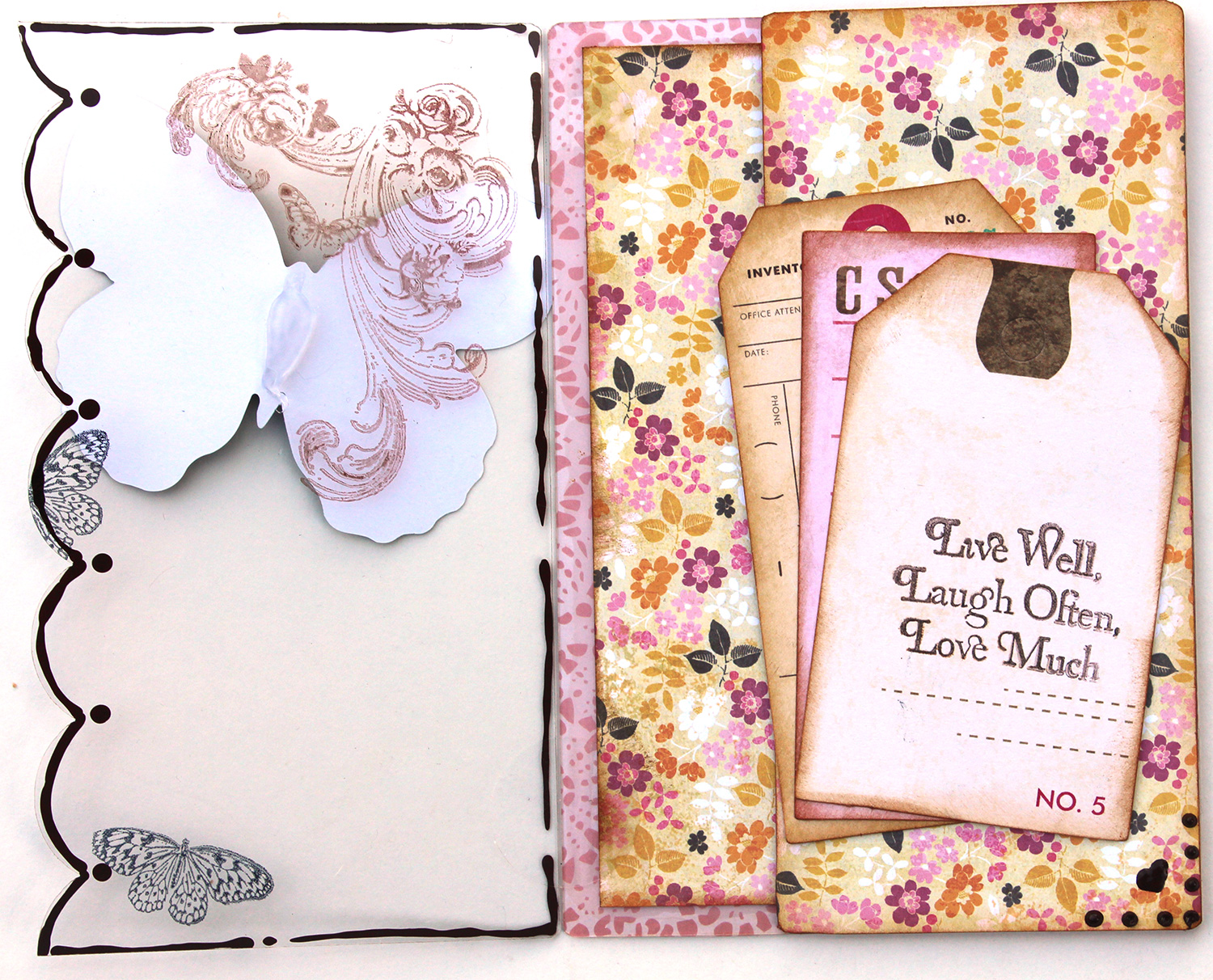 The butterfly and tags are from Crate paper, the Maggie Holmes ephemera. I stamped the sentiment Live Well, Laugh Often, Love Much on one of the tags, and adhered those to the right panel.
