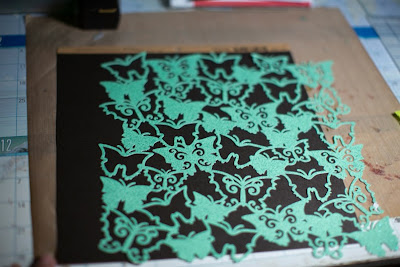 The black cardstock and butterfly lace paper goes under the acrylic sheet, then place the photo and all other embellishments on top.
