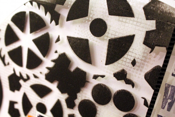 Supplies Used: Clear Scrap (12 x 12 Gears Mascil, XL Deco Shape, Gears Embellishments), Dreamweavers Black Embossing Paste, Stampendous alphabet stamps, Tattered Angels Oil Slick Glimmer Glaze, white gesso, Archival ink