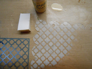 The base of this frame is a page from the Clear Scraps Scalloped Square Album. I've created a number of vintagy looking frames with these pages, and they may eventually come together to create an album, but for now I have them on display around the house. I used the 6" Mascils Quarterfoil stencil and distressed acrylic stain to daub a pattern on the backside of the page.