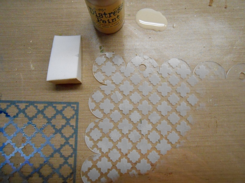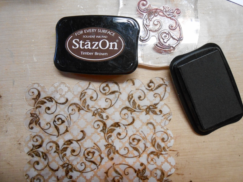 After stenciling the back, I used Stazon Brown and a flourish stamp to stamp a pattern on the front side.