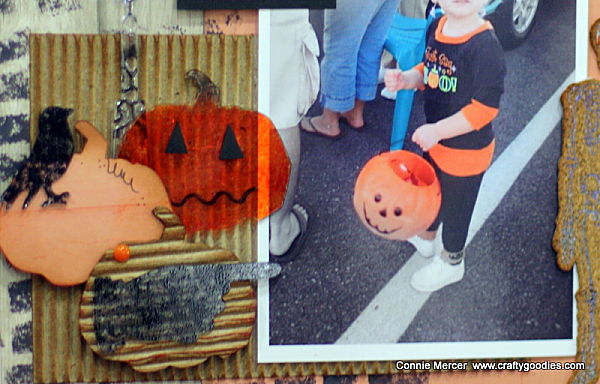 I used the 6" brick wall Mascils on each corner, with some black acrylic paint. The Clear Scraps lamp post shape is embossed with a Sizzix embossing folder. I only own five, so one I had on hand. The shapes ( pumpkins, hand and black bird) are cut out of a 12"x12" sheet of acrylic.