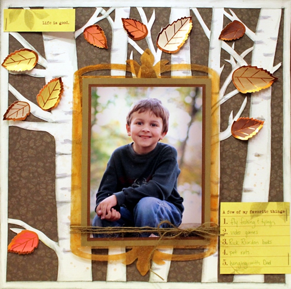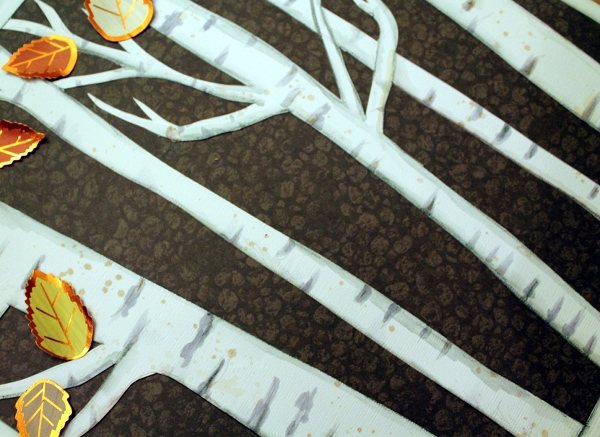 I colored the birch trees in with copics and water color pencils. I added SEI Diecut leaves to complete the birch tree look.